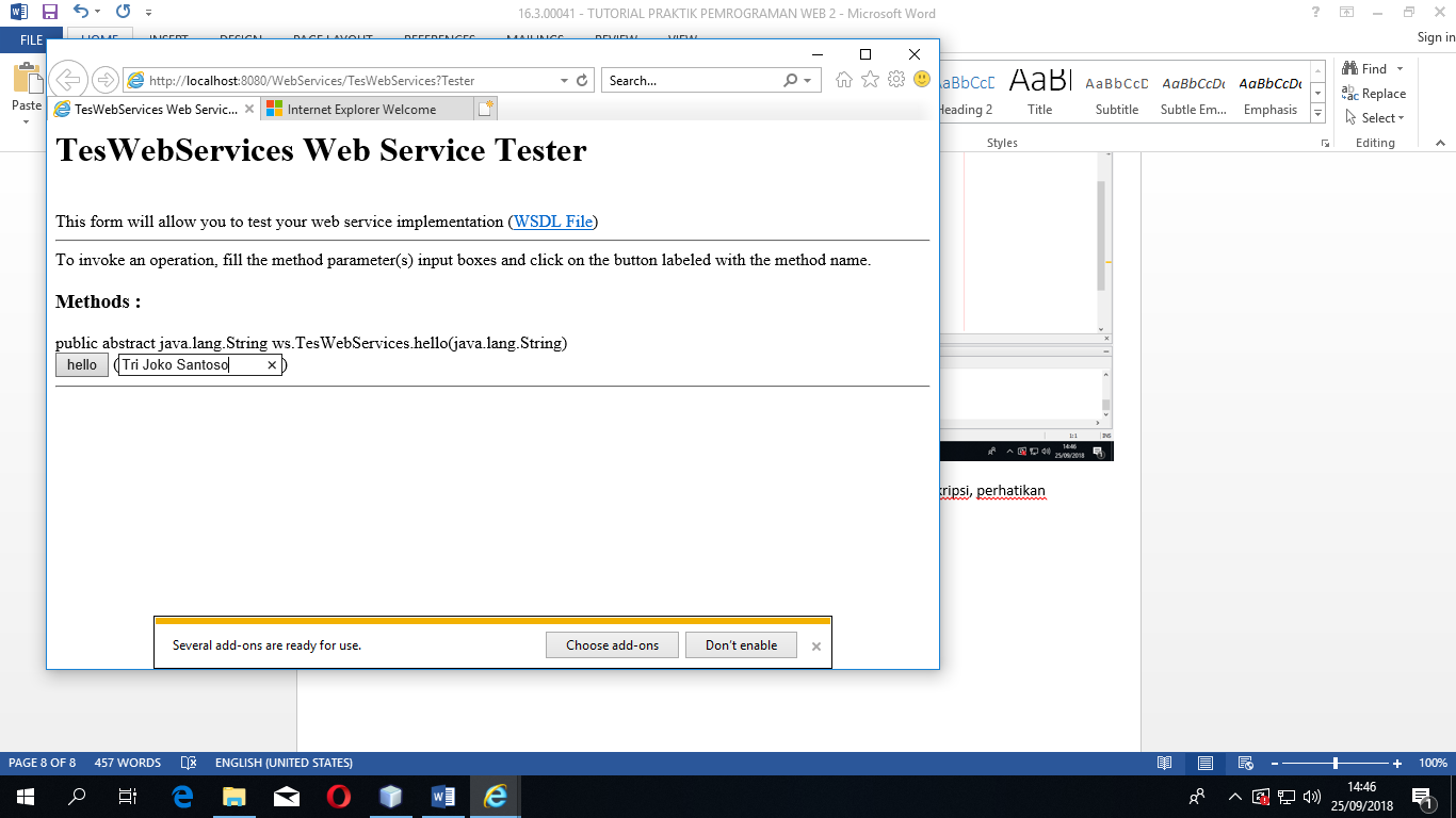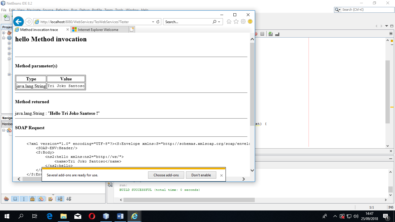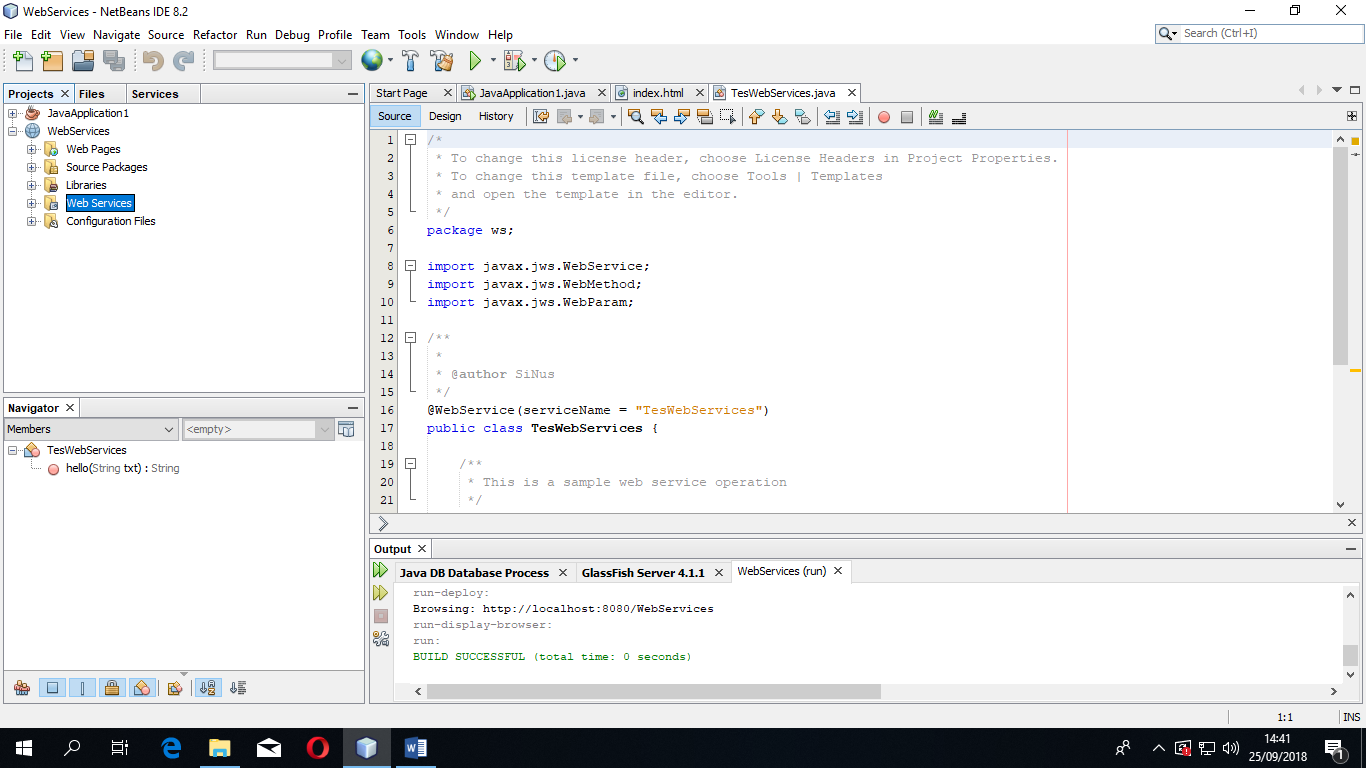 - Selanjutnya kita jalankan, yaitu dengan klik kanan pada Project WebServices -> lalu pilih Run maka tampil web browser sebagai berikut.