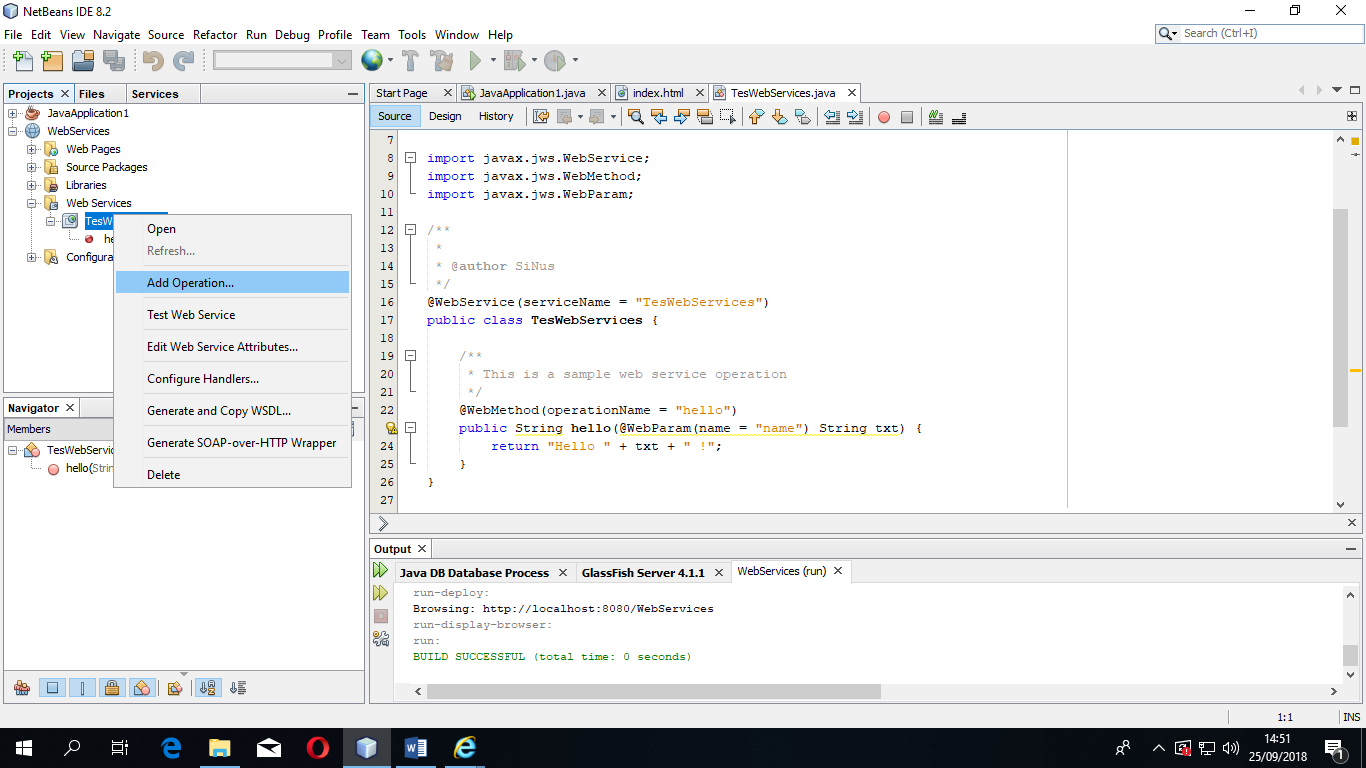 - Pada web services yang telah dibuat diatas, kita buat method baru dengan menambahkan Operator baru, caranya klik kanan nama web services -> Add Operations..