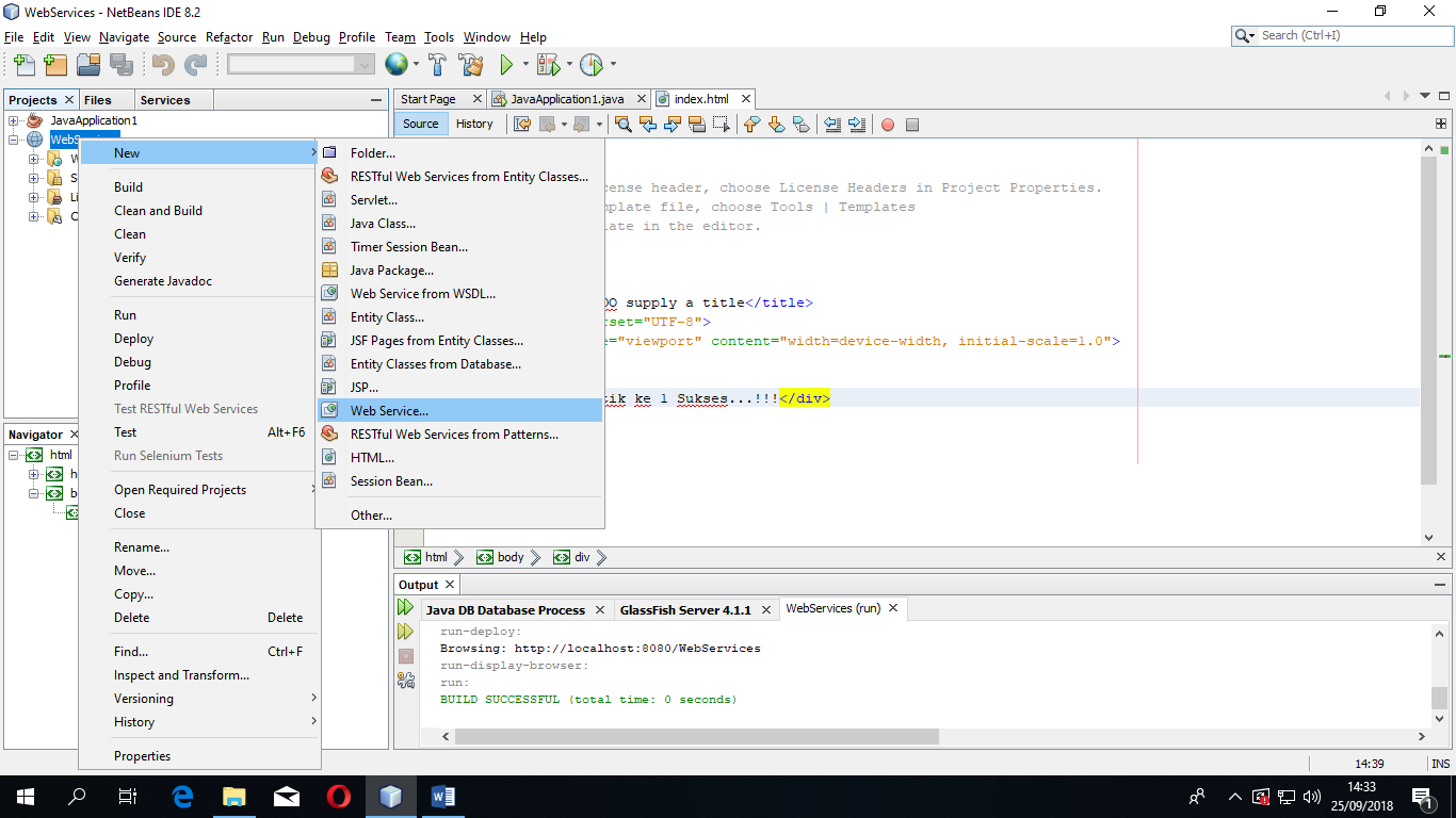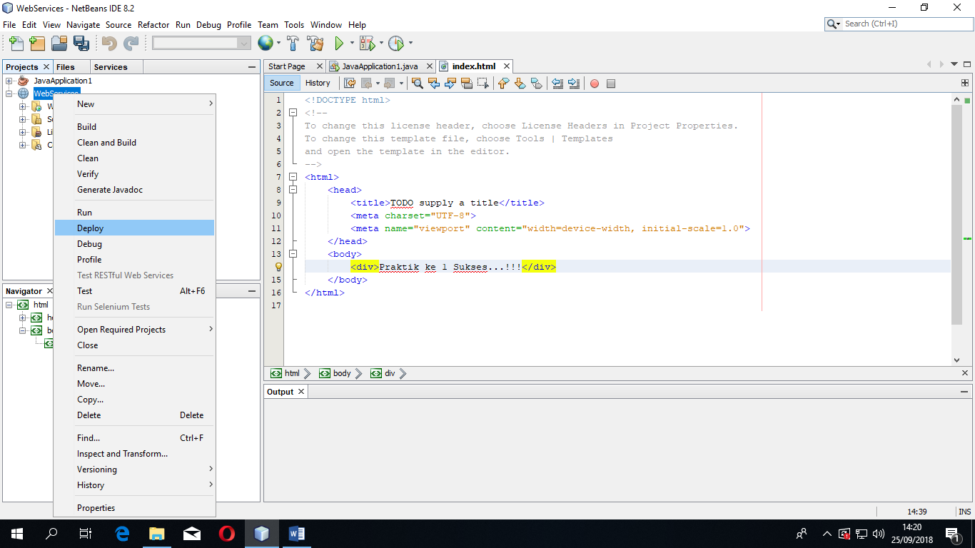 - Caranya klik kanan pada Project WebServices -> pada halaman index.html, beri tulisan “Praktik ke 1 Sukses..!!”